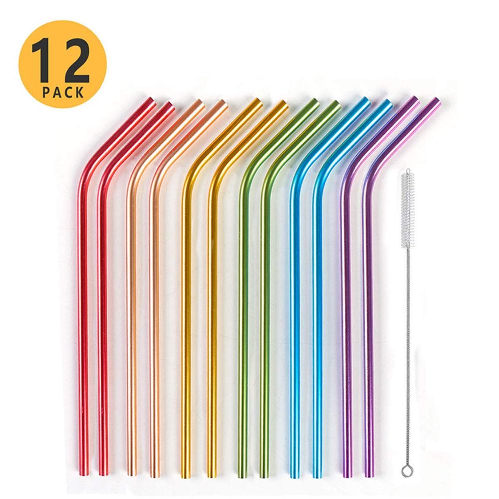 Reusable Rainbow Metal Drinking Straws with Cleaning Brush, Colorful Curved Aluminum Straws for Birthday Presents Party Favors